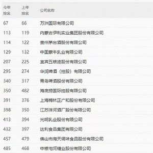 其中,伊利、贵州茅台、蒙牛、五粮液、海底捞和海天6家公司的排名比去年有所上升,而万洲国际、华润啤酒、青岛啤酒、梅林正广和、洋河、光明乳业、达利食品和中粮屯河糖业8家公司的排名比去年有所下降。
