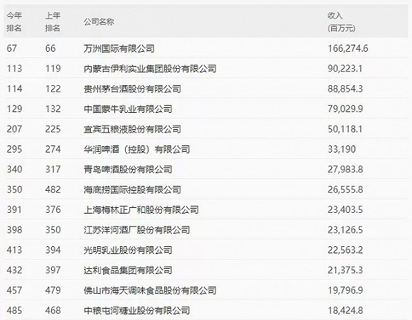 原标题:中国财富500强有14家食品饮料公司上榜,伊利蒙牛海底捞等排名上升