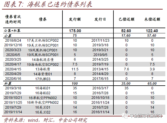 点评:海航系股权关系复杂,关联交易较多,历史投资较为激进依赖再融资,但2017年以来负面消息频发,再融资渠道收紧,流动性压力明显加大。除了永续债展期之外,海航系目前已有9家发行人的15支债券发生违约。海航系企业体量庞大,股权关系复杂,存在交叉持股、关联交易、互保等问题,资金往来频繁。历史投资较为激进,对再融资依赖程度较高。但2017年以来负面消息不断,2017年11月20日新浪财经报道,海航集团旗下一家子公司寻求将一笔2017年11月24日到期的35亿港元过桥贷款的偿付日期推后至2018年2月,公司愿为延期期间额外支付高于原贷款利率的利息,延期偿付虽得到所有贷款方的同意,但该新闻的披露引发市场针对海航偿债压力和流动性风险的诸多讨论。2018年1月财新等媒体关于“海航集团董事局主席陈峰对路透社承认公司出现流动性难题”的报道再次加剧了投资者对海航系流动性压力的担忧情绪。海航集团自身2017年以来未有成功融资,下属控股子公司境内债券发行量明显萎缩,新发债票面利率基本都在7%以上。除了永续债展期海外,海航系截至目前共有9家发行人的15支债券发生违约(含展期等信用角度的广义违约),涉及债券金额合计175亿元,其中2018-2020年新增违约发行人分别为1家、3家和5家。具体而言,2018年8月公募债券17美兰机场SCP002发生技术性违约,系海航系发行人的首笔违约,此后2019年海航集团、天津航空、大新华航空、美兰机场4家企业的7支债券违约,2020年以来凤凰机场、海航酒店、海航控股、海航集团、海航资本、凯撒同盛6家企业的7支债券未能按时足额兑付。从海航系的案例也可以看出,对于关联方往来频繁的发行人,当整个“系”整体出现资金链问题时,企业也难以独善其身,所谓“一荣俱荣,一损俱损”。