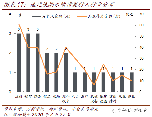 上述33支递延展期永续债来自22家债券发行人。根据中金行业分类,城投、航空和煤炭各有3家发行人涉及递延展期,化工、机场和综合投资各2家,电力、港口、机械设备、基建设施、建筑建材、农业和造纸各1家。
