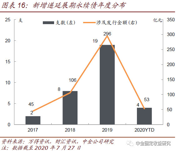 永续债递延展期案例2017年首次出现,2018和2019年涉及债券支数和金额每年增长超过1倍,不过2020年以来展期案例较2019年同期有所放缓。分年份来看,永续债递延展期案例于2017年11月首次出现,全年共发生2起,涉及的债券发行金额合计45亿元。2018年开始数量明显增长,全年共发生8起、涉及债券发行金额106亿元,主要是集中在下半年。2019年涉及递延展期的永续债支数进一步增至19支、涉及金额也增至296亿元,较2018年均增长超过1倍。2020年截至目前继续有4支债券递延展期、涉及发行金额53亿元,较2019年同期有所放缓。