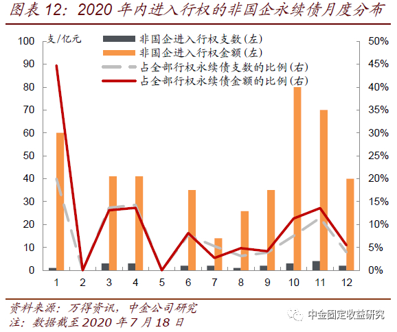 非国企发行永续债较少,但从月度分布来看下半年行权偿付压力也将明显高于上半年,尤其是四季度较为集中。由于永续债发行人绝大部分为国企,因此2020年内进入行权的非国企永续债也较少,全年共23支、金额合计442亿元,占同期进入行权的全部永续债支数和金额的比例分别为7%和8%。其中上半年进入行权的非国企永续债共9支、177亿元,下半年为14支、265亿元,下半年较上半年的行权偿付压力也增长较为明显。分季度来看,三季度进入行权的非国企永续债共5支、75亿元,四季度共9支、190亿元,相比之下四季度进入行权的非国企永续债更为集中,特别是10月份和11月份。