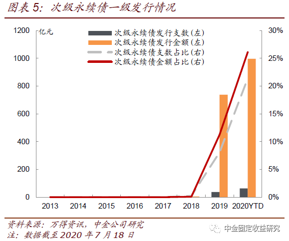如图表4,2013-2017年发行的永续债中无次级永续债,2018年首支次级永续债18越秀集团MTN007发行,发行支数和金额占2018年永续债全部发行支数和金额的比例分别仅为0.2%和0.1%。2019年发行次级永续债37支、金额合计738亿元,较2018年明显增长,占2019年永续债全部发行支数和金额的比例分别为8.1%和11.2%。2020年统计截至7月18日共发行次级永续债63支、金额合计997亿元,已超过2019年全年水平,占同期永续债全部发行支数和金额的比例也进一步攀升至21.4%和26.2%。