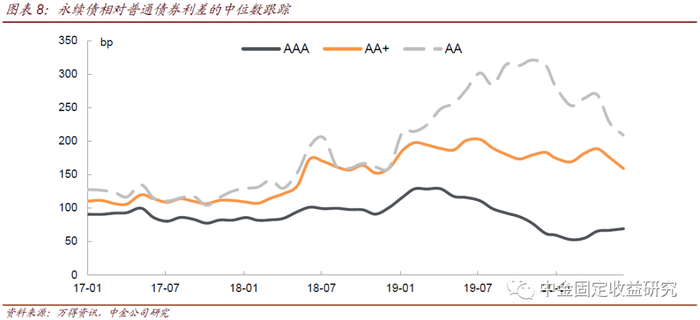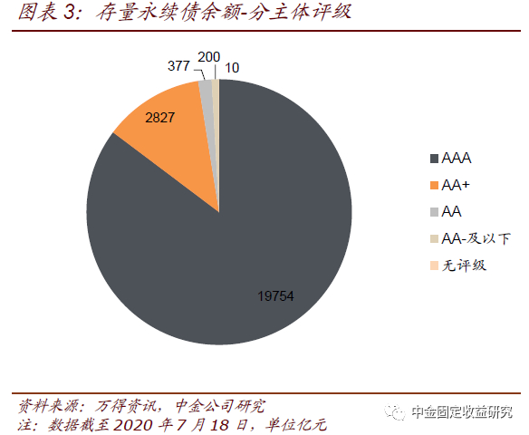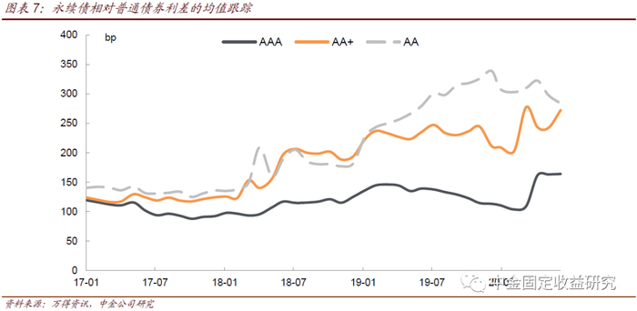 截至2020年6月末AAA、AA+和AA评级永续债利差均值分别为164bp、272bp和284bp,中位数分别为69bp、159bp和208bp。