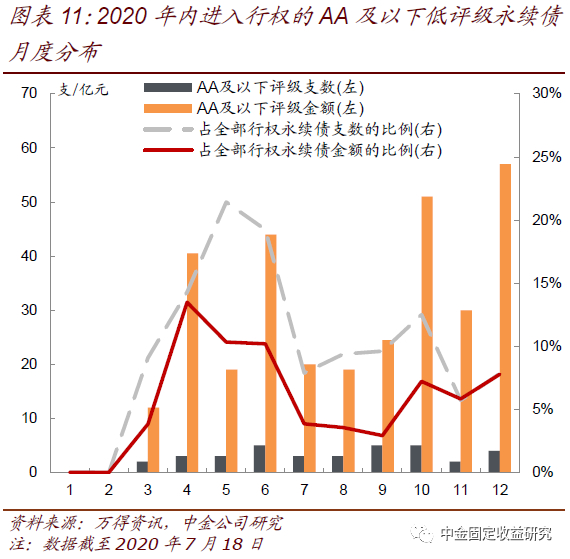 年内面临行权的低评级永续债相对不多,不过下半年较上半年增长接近1倍,10月和12月是进入行权金额的相对高点。2020年内债项AA及以下低评级永续债进入行权的支数和金额相对不多,分别为35支和317亿元,占同期进入行权的全部永续债支数和金额的比例分别为10%和6%。低评级行权量较小与永续债的发行人主要为中高评级主体有关。其中下半年AA及以下低评级进入行权的永续债支数和金额合计分别为22支和202亿元,分别占全年行权量的63%和64%,较上半年增长接近1倍。从月度分布来看,下半年的10月和12月是低评级行权永续债规模的相对高点,涉及的永续债余额分别为51亿元和57亿元。