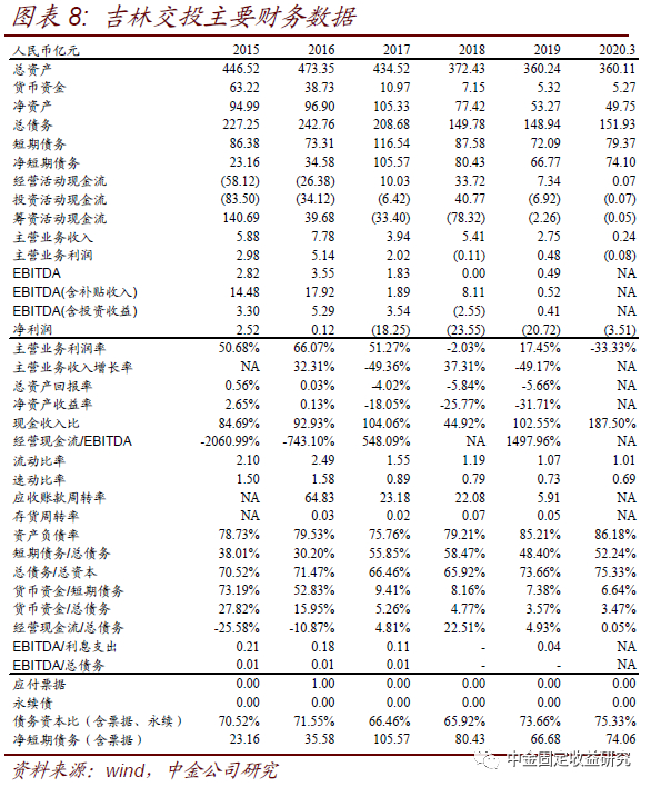 点评:吉林交投是第一家在永续债票面利率面临大幅加点的情况下仍选择展期的城投发行人,属于城投平台打破刚兑进程中的再进一步。未来城投区域分化的格局仍将延续,信用下沉仍应有底线。吉林交投为吉林省级铁路投资公司,吉林省2018年一般预算收入为1240.84亿元,支出为3789.59亿元。近年来随着公司净利润持续大幅亏损,净资产规模缩水明显。此外公司自身流动性压力较大,公告截至2019年5月末账面货币资金余额仅5.98亿元,其中3.27亿元受限,而总债务规模超过150亿元,债务资本比68%,短期债务规模接近90亿元。截至2019年3月末公司授信余额均已全部使用完毕,外部流动性也较为紧张。除公司自身周转压力以外,永续债展期可能也与当地财政压力较大、政府对城投平台支持能力下降有关。永续债续期虽然从法律意义上不属于违约,但是投资者普遍解读为该平台资金链存在问题,属于城投平台打破刚兑进程中的再进一步。吉林交投永续债续期事件也说明了经济欠发达、财政实力较弱地区的城投平台面临更大的风险,城投未来区域分化的格局仍将延续。在择券方面,负债成本压力下的信用下沉应有底线,对于财政实力较弱、债务负担较重区域、边缘化城投仍需回避。