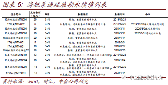 事件:海航系自2018年10月首次出现永续债展期以来,截至目前已有6家发行人的12支永续债发生递延展期,其中4支仅涉及本金展期、3支仅涉及利息递延、5支同时涉及本金展期和利息递延。2018年10月海南航空控股股份有限公司(“海航控股”)发行的中票15海南航空MTN001在票面利率加点300bp的情况下仍选择展期,拉开了海航系发行人永续债频繁递延展期的帷幕。截至目前涉及永续债递延展期的海航系发行人已达6家,除了海航控股之外,还包括三亚凤凰国际机场有限责任公司(“凤凰机场”)、天津航空有限责任公司(“天津航空”)、海航集团有限公司(“海航集团”)、云南祥鹏航空有限责任公司(“祥鹏航空”)和海口美兰国际机场有限责任公司(“美兰机场”)。其中,天津航空有3支永续债递延展期,海航集团、美兰机场、海航控股和凤凰机场分别有2支,祥鹏航空1支,共计12支。按展期类型划分,仅涉及本金展期的有4支,分别为15海南航空MTN001、16海航集团可续期债01/02、17祥鹏MTN001,其中16海航集团可续期债01/02不涉及加点跳升,15海南航空MTN001、17祥鹏MTN001均加点300bp。仅涉及利息递延的有3支,分别为17凤凰MTN001/002、17美兰机场MTN001。其余的5支同时涉及本金展期和利息递延,包括16海南航空MTN001、16天津航空MTN001/004、16美兰机场MTN001和17津航空MTN001。