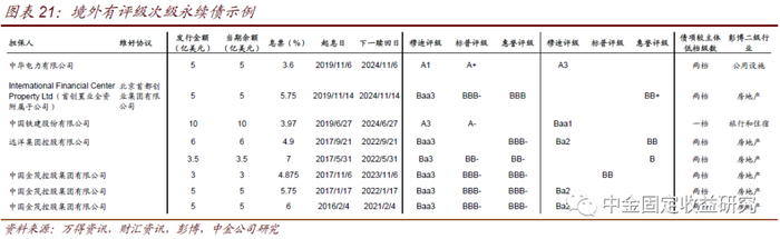 永续债设有担保增信是“有中国特色”的新兴事物,因此并无国际评级经验可以借鉴。不过中资美元债由于其结构上的次级属性,通常设有境内经营主体担保,从中资美元债的经验看,债项评级通常在担保人评级基础上下调1-2档,并且下调一档还是2档,通常取决于担保人资质,如担保人评级为A3的铁建,债项评级比主体低一小档;而担保人评级为BBB或BB大档的远洋、金茂等,债项评级均比担保人低2小档。