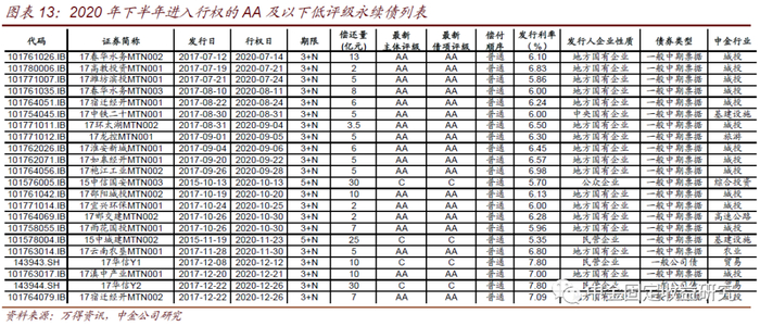 2020年下半年进入行权的AA及以下低评级永续债、非国企永续债具体信息详见图表13和图表14。除此之外,我们还整理了下半年进入行权的、票面利率分段且前期票面利率不跳升的永续债,如图表15。由于缺乏票面利率惩罚机制,这部分永续债从条款设置的角度来讲选择进行递延展期的可能性相对更大。