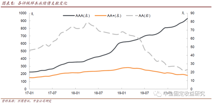 需要注意的是分评级样本券支数的变化,AAA样本券持续大幅增长,而AA评级持续减少,目前仅23支。AAA评级样本券支数呈上升趋势,从2017年1月末的224支大幅增至2020年6月末的931支;而AA+评级样本券支数基本在150-285支区间震荡,变化不大;反观AA低评级,样本券支数相对AAA和AA+评级一直较少,在样本区间最多的时点也不足80支,而且从2018年下半年开始出现比较明显的下降,截至2020年6月末仅有23支,可能与2018年下半年以来永续债递延展期案例明显增多,同时违约大幅增长,市场风险偏好有所下降,低资质企业发行永续债难度上升有关。
