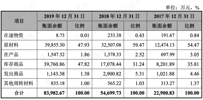 存货一看也是猛增的,2017年-2019年存货分别为2.29亿、5.47亿和8.39亿,主要是原材料和库存商品增多。
