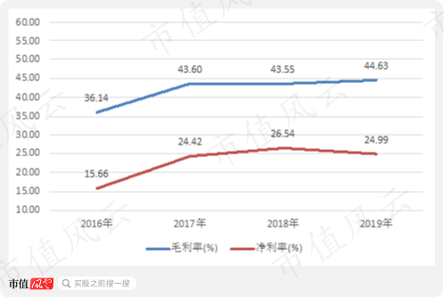 凯赛生物收入增长迅速,从2017年13.63亿增长到2019年19.16亿,相对于2016年毛利率和净利率提升得比较明显,目前毛利率维持在44%左右,净利率在24%左右的水平。