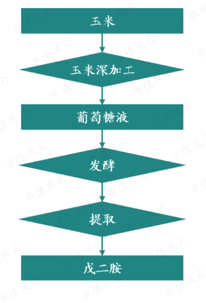 生物基戊二胺主要是用玉米作为原材料,经过淀粉酶和糖化酶的水解作用,将淀粉水解为葡萄糖液,然后也是用生物发酵制成戊二胺。