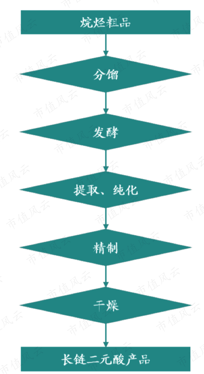 长链二元酸主要原材料是烷烃:外购的烷烃粗品精馏分馏得到合格的烷烃;再通过菌种发酵;提取纯化得到二元酸粗品,干燥后得到成品。