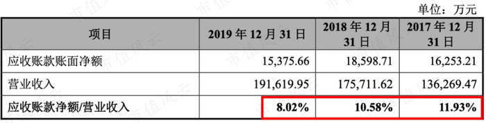 当然应收账款肯定有,但是占比极低,2017年-2019年占比为11.93%、10.58%、8.02%,反而越来越少。