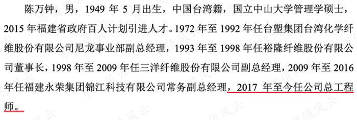 另一位核心技术人员陈万钟是2015年福建省政府百人计划引进人才,曾经在台塑集团有尼龙的工作经历,目前担任总工程师。