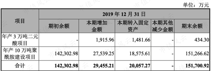 在建工程金额近三年一直在增加,分别为:二元酸3万吨产能的扩增,完工进度在85%,而年产10万吨聚酰胺项目还处于中试阶段,完工进度在82%。