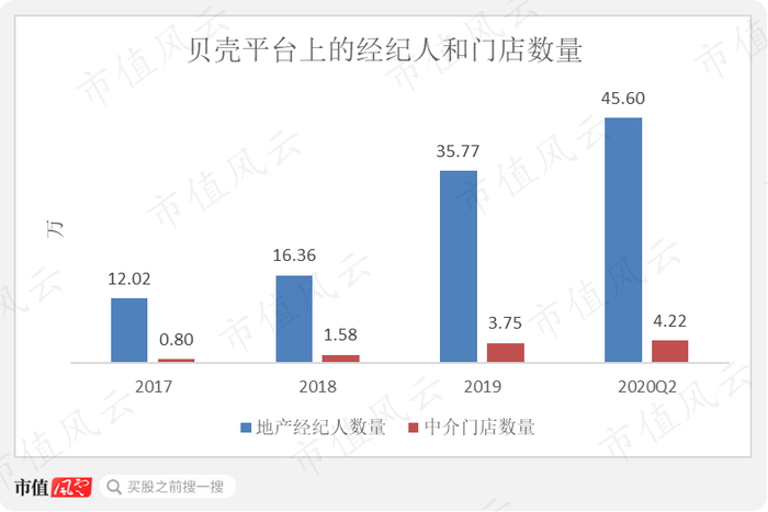 截至2020年6月底,贝壳平台上共有45.60万地产经纪人,以及4.22万个中介门店。