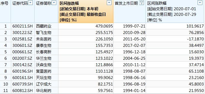 此外,近期疫苗股行情火爆,西藏药业、智飞生物、复星医药等个股7月份以来累计涨幅均超60%,西藏药业期间涨幅翻倍。