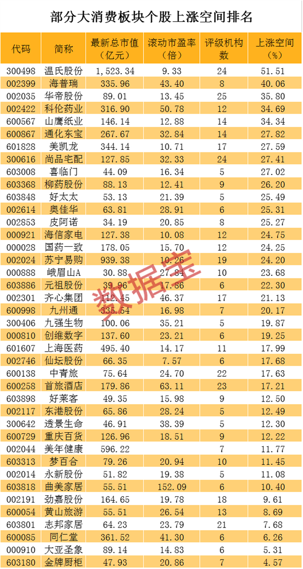 机构关注度最高的是老板电器,有35家机构评级。索菲亚位居次席,34家机构评级。此外,华帝股份、爱婴室、温氏股份等个股评级机构数均超过20家。从上涨空间来看,温氏股份上涨空间最大,超过51%。此外,海普瑞、华帝股份、科伦药业、山鹰纸业等个股上涨空间均超过30%。(数据宝陈见南)