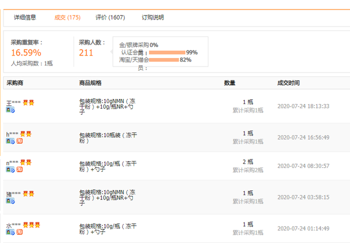 一款NMN10g装的原料产品,不到24小时里有5位消费者购买。