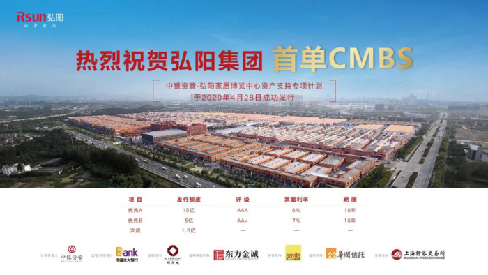据弘阳集团官方微信4月29日显示,“中银资管-弘阳家具博览中心资产支持专项计划”于4月28日成功发行,计划管理人为中银资管,监管/托管银行为光大银行,这也是弘阳集团成功发行的首单CMBS。