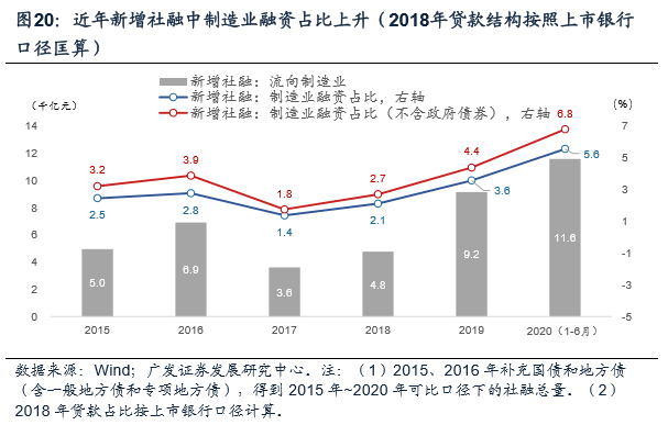 本轮信用扩张进程中制造业融资占比趋势上行。2018年以来制造业融资占比趋势上行,尤其今年上半年,制造业融资占比攀升至6.8%,较2019年的4.4%走高2.4个百分点,基本上是2015年以来占比提升速度最快年份。显然,今年上半年制造业企业融资占比提升并非因为企业因盈利改善而选择主动加杠杆,而更多是因为两个外生因素,一则地产融资占比下行;二则政府有意打开制造业融资条件,例如利用MPA考核加大对制造业长期信贷的投放,又例如设计直达实体融资工具等。