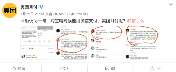对此,美团月付再发微博做出回击:“hi,顺便问一句,淘宝啥时候能用微信支付、美团月付呢?”