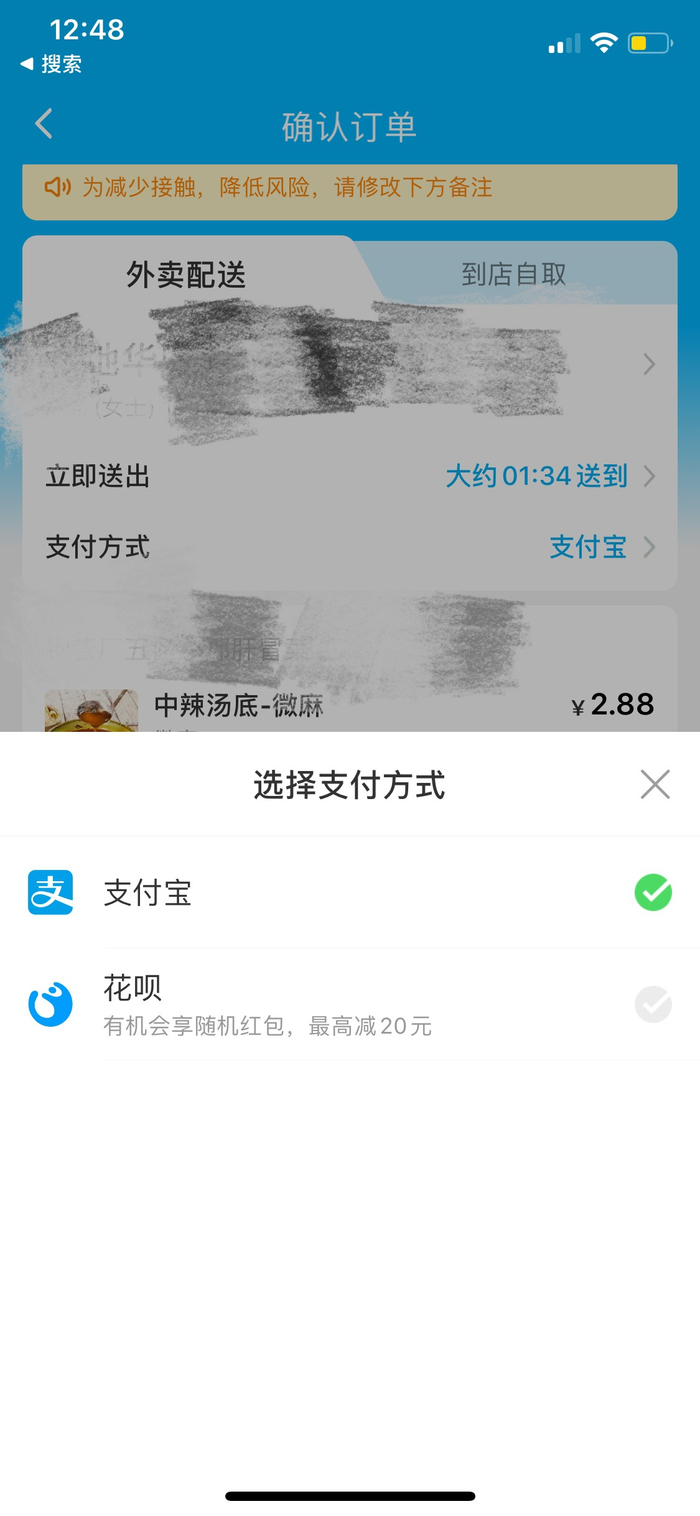 饿了么是先选择支付方式再完成下单,澎湃新闻记者使用的饿了么App显示只有支付宝和花呗两种选项。