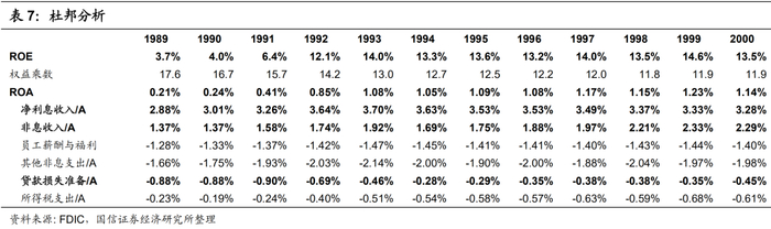 根据杜邦分析,1990年代美国银行业非息收入对ROA贡献持续提升,资产质量改善带动贷款损失准备对ROA拖累下降,净利息收入仍是主要贡献因子,但1990年代贡献度有下降态势。