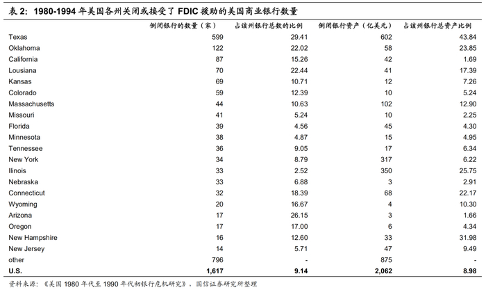 美国1927年制定的《麦克法登法案》禁止商业银行跨州设立分支机构,实行单一银行制度,使得美国银行业务区域集中无法抵御局部性的经济波动或衰退,这也体现在了1980-1994年倒闭的银行高度集中在少数几个地区。1980-1994年有三次比较大的地区和部门经济衰退造成了大范围的区域银行破产,受1980年代两次石油价格暴跌影响经济严重衰退的地区的银行(路易斯安那州、俄克拉荷马州、德克萨斯州等)、1980年代初农产品价格下降导致过于集中农业贷款的银行大量破产(堪萨斯州、俄克拉荷马州、内布拉斯加州等)、相关不动产衰退区域银行(加利福尼亚州、东北部地区和西南地区)。根据《美国1980年代至1990年代初银行危机研究》披露,1980-1994年关闭或接受了FDIC援助的1617家美国商业银行(不包括储蓄银行)中破产数量前五个州占比达58.6%。