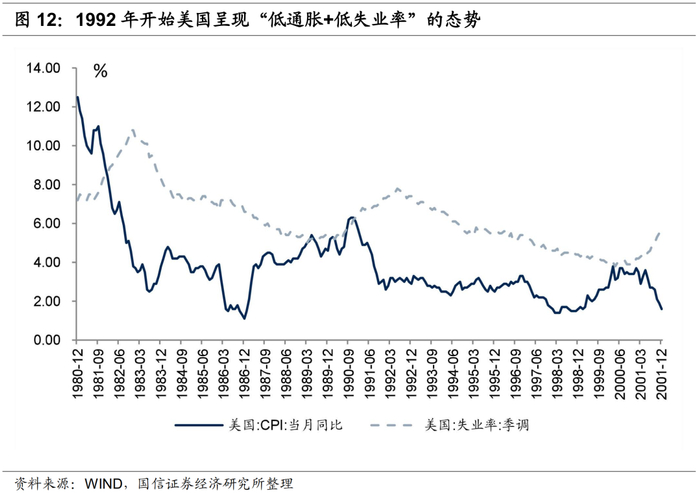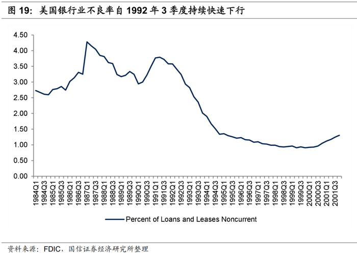 美国经济自1992年3月复苏,连续十年呈现“高增长+低通胀+低失业率”的繁荣态势。同时,1990年代美国房地产景气度持续提升,不动产抵押贷款资产证券业务快速扩张,经济的高增长和房地产繁荣为美国银行业提供了很好的经营环境。