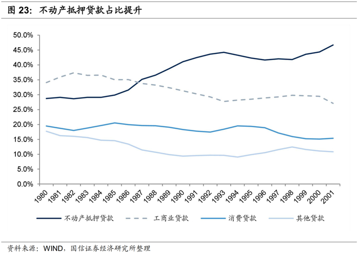 伴随美国经济1993年以来的持续高增长,美国银行业总资产规模实现了较好的扩张,1993-2000年美国银行总资产年均扩张速度为7.4%,其中信贷年均扩张速度为7.8%。受益于房地产市场的繁荣,美国不动产抵押贷款扩张速度较快,1993-2000年年均扩张速度为8.0%。