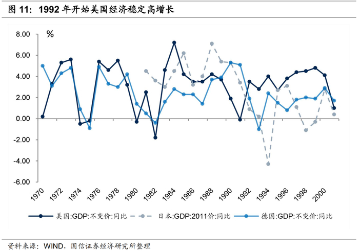 美国经济经历了1990-1992年2月的温和型衰退之后,自1992年3月份开始复苏,连续十年呈现“高增长+低通胀+低失业率”的繁荣态势,是美国历史上经济高增长持续时间最长的时期之一。而1990年代的日本、德国等主要经济体普遍低迷,繁荣的经济为美国银行业提供了很好的经营环境。支撑此轮美国经济繁荣的因素有很多,其中银行机构通过兼并收购增强经营能力,提高金融资源的配资效率是推动美国经济增长的重要因素之一。