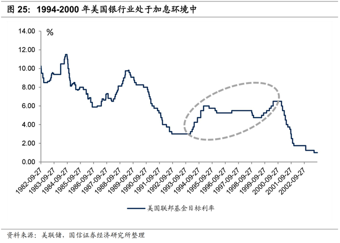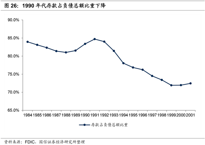 1993-2000年美国银行净息差趋势性下行,主要是负债端成本提升拖累。1999年美国银行业净息差为3.87%,较1992年收窄了43bps,但明显高于1980年代美国银行业净息差水平。1994美联储进入加息周期,一直持续到2000年,美国银行生息资产收益率呈现稳定小幅上升态势。净息差收窄主要是负债端成本上行拖累,一方面是美国金融市场发展较快,货币市场基金等规模的快速扩张分流美国银行业存款,存款占负债总额的比重有所下降;另一方面是1986年美国存款利率市场化完成,美国存款成本大幅上行。