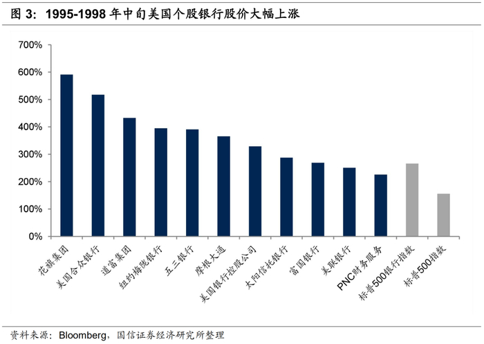 美国银行业从1990年代初期的困境逐步走向繁荣,盈利能力持续增强,进入稳定发展新阶段。1995年初至1998年7月14日,标普500银行指数上涨了266%,同期标普500指数上涨156%,银行股投资价值巨大。