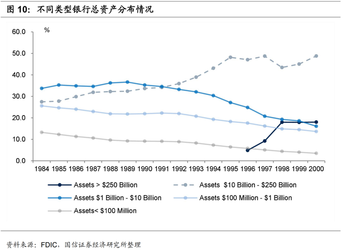 经过1980-1990年代兼并收购潮之后,美国银行业机构数量大幅减少,集中度快速提升,出现了超大型金融控股集团。截止2000年末,FDIC担保的银行机构数量为9904家,较1985年末减少了8129家,其中,期末资产规模少于1亿美元的银行机构数量为5464家,减少了8167家。在这一时期,美国出现了3家资产规模超过2500亿美元的大型银行集团(花旗集团、美洲银行公司、大通曼哈顿金融公司);同时,2000年末资产规模在100-2500亿美元之间的银行机构数量为98家,较1985年末增加了62家。从资产份额来看,截止2000年末,资产规模在100亿美元以下的银行机构总资产份额为37.1%,较1985年下降了35.1个百分点;资产规模在100亿美元以上的银行机构资产份额则提升至62.9%,其中,资产规模在2500亿美元的三家大型银行资产份额为17.9%,银行资产集中度大幅提升。