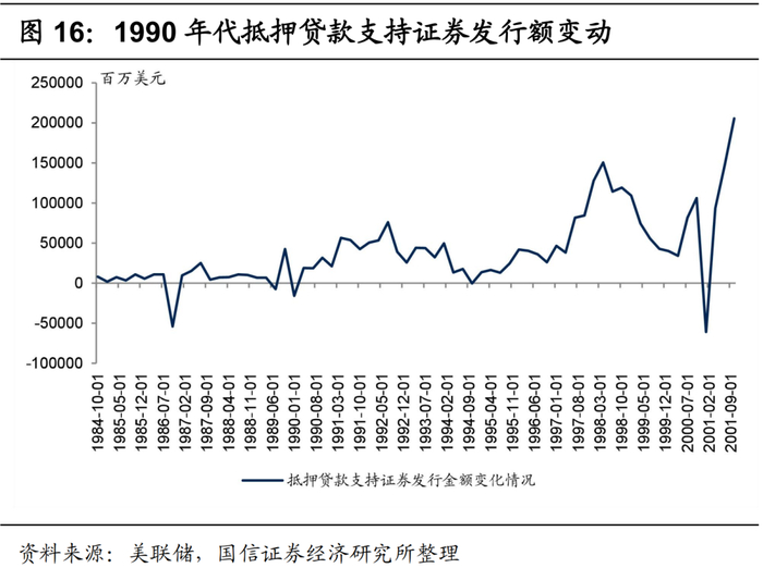 1990年代开始,美国房地产市场经历了一轮景气度持续提升的过程,助推了美国经济的持续增长。新建住房销售从1991年的50.9万套持续提升至2005年的128.3万套。这一时期美国房地产市场景气度持续提升与抵押贷款资产证券化的蓬勃发展紧密相关,其中1991年初1-4户住宅抵押贷款支持证券余额为594亿美元,但到了1999年末该余额已经达到了3543亿美元。
