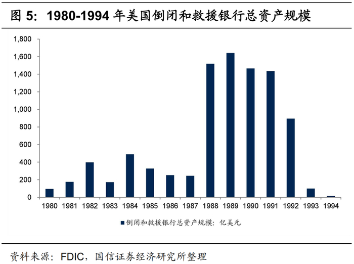 1980-1994年的美国银行业兼并收购是为了化解危机,为之后银行业的崛起奠定了基础。此阶段大量中小银行破产倒闭,且集中在少数几个地区。另外,对伊利诺斯大陆银行的救援体现了“太大而不能倒”原则。