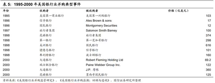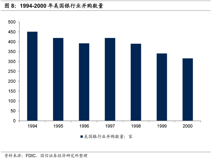 美国单一银行制度和分业经营被打破,为美国银行并购提供了良好的法律环境。1994年《州际银行法》颁布,打破了1927年《麦克法登法案》以来单一银行制度限制,允许商业银行跨州设立分支机构,美国银行业掀起了一轮以扩大规模为目的的并购。1999年11月,美国通过了《金融服务现代化法》,废除了1933年《格拉斯-斯蒂格尔法》分业经营的限制,美国全面进入混业经营的时代,银行通过并购保险、证券向全能银行迈进。根据FDIC年报披露,1994-2000年美国银行业共发生了2728例并购,其中不乏美洲银行和国民银行、花旗集团和旅行者集团此类强强合并的案例。