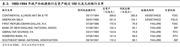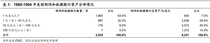 中小银行抵御风险的能力较弱,在此轮银行业危机中大量破产倒闭。1980-1994年倒闭和救援银行中资产规模在1亿美元以下的有1865家,资产规模在1-10亿美元之间的有887家,分别占倒闭和救援银行机构总数的63.5%和30.2%,而资产规模超过100亿美元的倒闭和救援银行仅7家。