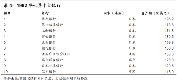 通过一系列的兼并收购,美国银行业的资产规模和国际竞争力得到显著提升。根据《银行家》杂志披露的2000年按资本总额排名的世界十大银行,花旗集团、美洲银行和大通曼哈顿银行分别排第一名、第二名和第五名,三家银行都是通过并购升级提升了国际竞争力,美国重新捍卫了世界金融霸主的地位。