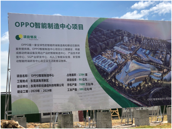 记者在交椅湾施工现场看到了OPPO智能制造中心,占地面积1394亩,项目总投资90亿元,建设工期2020年-2024年,据保安介绍,该项目今年3月份已经正式动工。