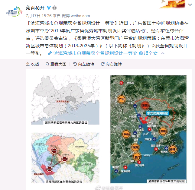 据广东省东莞市人民政府新闻办公室官方微博“莞香花开”介绍,东莞市滨海湾新区城市总体规划(2018-2035年)曾荣获全省规划设计一等奖。从区位来看,由于临近深圳,该片区在整个东莞市、乃至大湾区的均处于重要位置。注意上面右图中,红色箭头所指地方即为滨海湾新区。