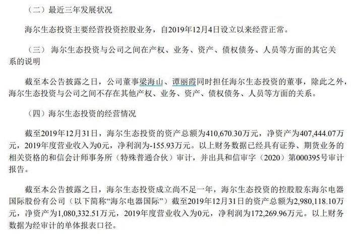 截至本公告披露之日,海尔生态投资成立尚不足一年,海尔生态投资的控股股东海尔电器国际股份有公司(以下简称“海尔电器国际”)截至2019年12月31日的资产总额为2980118.10万元,净资产为1080332.51万元,2019年度营业收入为0元,净利润为172269.96万元。以上财务数据为经审计的单体报表口径。