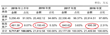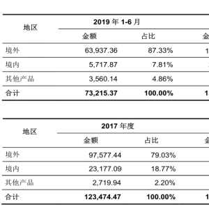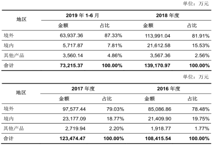 再看人工草坪产品的内销情况。据招股书披露,从2016年到2019年上半年,共创草坪境内销售收入分别为2.14亿元、2.32亿元、2.16亿元和5717.87万元,占当期主营业务收入之比分别为19.75%、18.77%、15.53%和7.81%,持续显著下滑。