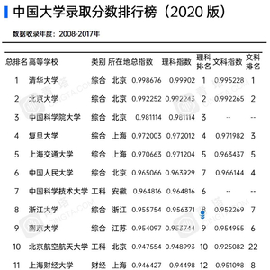 该榜单完全基于各大高校在过去10年(2008-2017)间,在各省本科第一批录取的文理科分数及人数的指标数据,通过统计分析后转换编辑完成的。