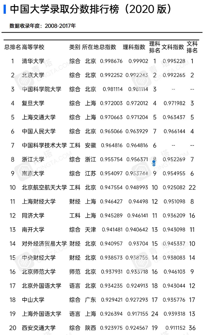 话不多说,先来看看过去10年中国最难考的20所高校排名。