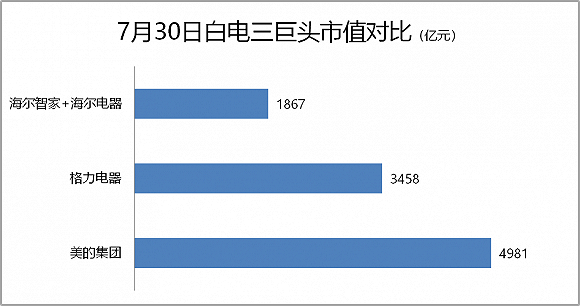 海尔集团两个上市平台市值之和不及美的集团总市值的一半,也远不及家电业务单一的格力电器。