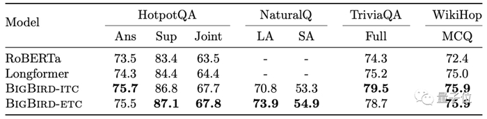而在对模型进行微调后,可以看见,BigBird-ETC在HotpotQA的Sup、NaturalQ的LA、TriviaQA的Verified和WikiHop上均超越了SOTA。